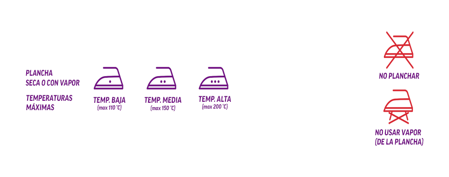 Si la plancha no tiene ningún punto, significa que puede planchar la prenda a cualquier temperatura. Normalmente, encontrarás el símbolo de planchado de un punto en prendas delicadas como la lana y la seda, el de dos puntos en prendas sintéticas y el de tres puntos en prendas de lino y algodón. Si aparece una cruz sobre el símbolo, significa que la prenda no es apta para el planchado, mientras que la imagen de dos líneas que salen de la parte inferior de la plancha con una cruz encima significa que «no está permitido planchar con vapor».