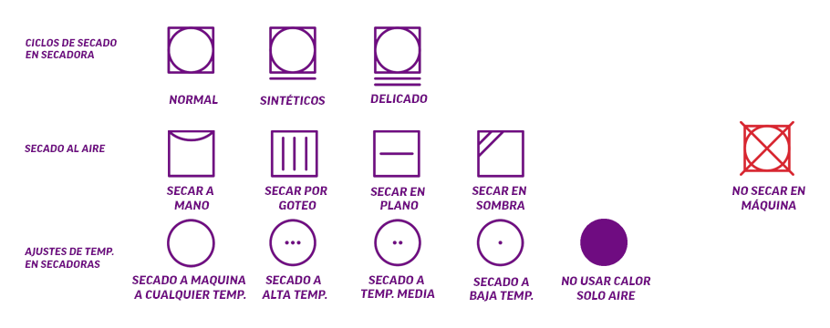 Además del lavado y el planchado, el cuidado de la ropa también incluye el secado. Para evitar que una prenda se encoja o deforme durante este proceso, la etiqueta de cuidado del tejido contiene una serie de símbolos prácticos que indican la manera más segura de secar la ropa sin dañar las fibras.
